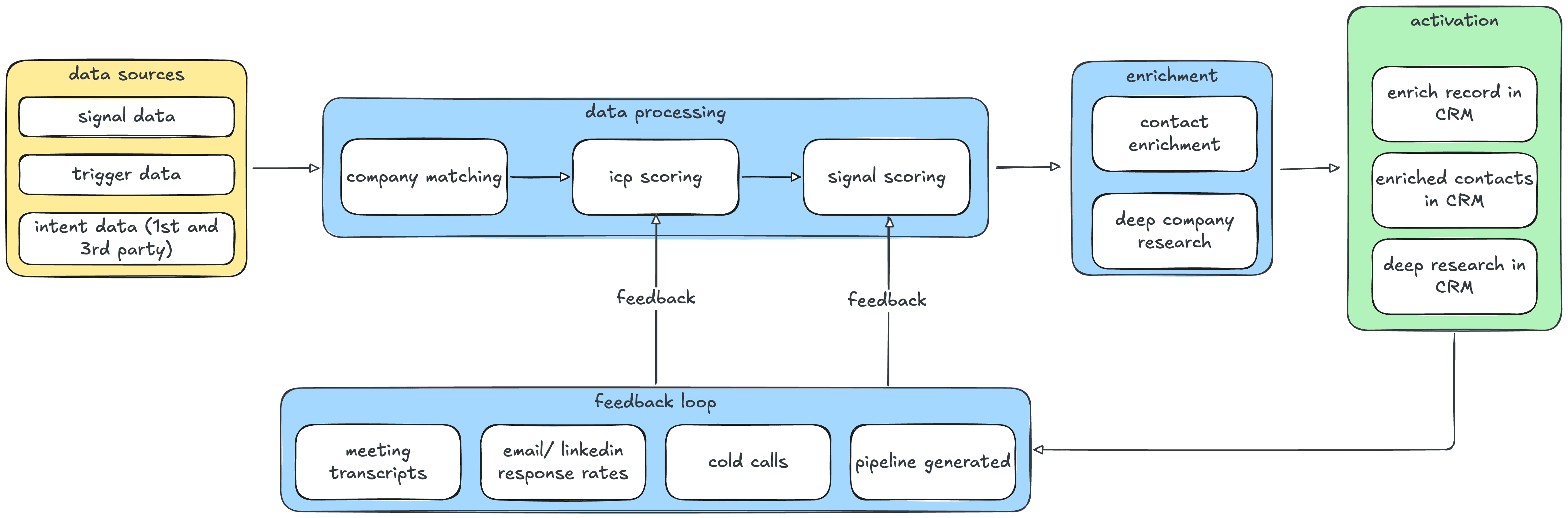 Mimics how humans learn: every customer interaction generates hypotheses, every new data point validates or rejects them. After each call, an agent classifies the conversation, reads existing hypotheses, generates new ones, updates the database. All reps' learnings compound into one continuously validated knowledge base. Critical for finding product-market fit faster. Every other system queries this for "what's true about this company/persona?" - your GTM runs on validated intelligence, not static assumptions.